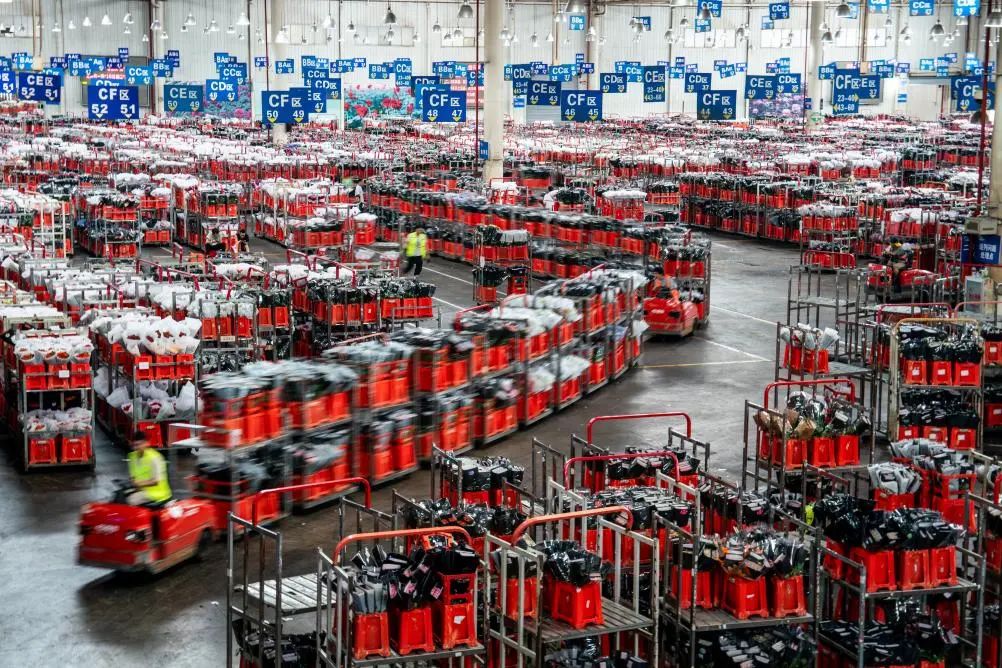 臺(tái)車在昆明國(guó)際花卉拍賣交易中心內(nèi)轉(zhuǎn)運(yùn)鮮花(7月9日攝)。新華社記者 胡超 攝