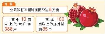 歷經了10多年的選育、種植、示范,永勝縣的軟籽石榴產業(yè)已初具規(guī)模。目前,全縣軟籽石榴種植面積達5萬畝,其中種植面積在10畝以上的大戶有388戶,建成100畝以上的連片基地35個。
