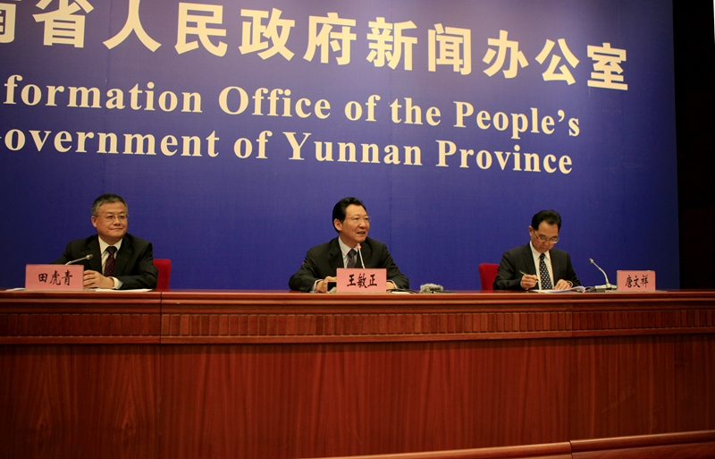 云南省人民政府新聞辦公室專職副主任田虎青主持發(fā)布會,云南省打造世界一流“綠色食品牌”工作領導小組辦公室主任、省委農(nóng)辦主任、省農(nóng)業(yè)廳廳長王敏正,云南省工業(yè)和信息化委員會副書記、副主任唐文祥分別發(fā)布新聞。