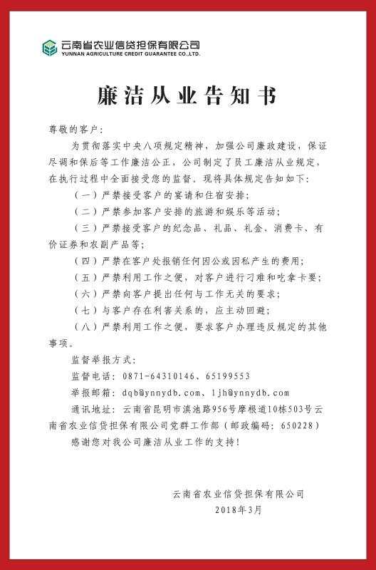 “一杯水”原則和《廉潔從業(yè)告知書》制度的實行,將對進一步強化員工的廉潔自律意識和廉潔從業(yè)意識,凈化公司廉政環(huán)境,加強公司廉政建設,維護公司良好形象發(fā)揮積極作用,托起云南農(nóng)擔服務三農(nóng)綠色美好愿景,讓云南農(nóng)擔在實現(xiàn)云南經(jīng)濟跨越發(fā)展和服務三農(nóng)方面走得更高更遠,發(fā)揮更大作用。