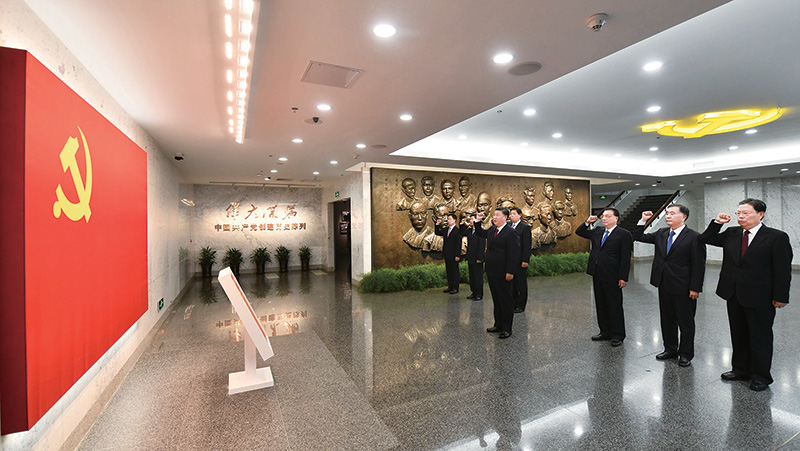 2017年10月31日,中共中央總書記、國家主席、中央軍委主席習(xí)近平帶領(lǐng)中共中央政治局常委李克強(qiáng)、栗戰(zhàn)書、汪洋、王滬寧、趙樂際、韓正,瞻仰上海中共一大會(huì)址和浙江嘉興南湖紅船。這是31日上午,在上海中共一大會(huì)址紀(jì)念館,習(xí)近平帶領(lǐng)其他中共中央政治局常委同志一起重溫入黨誓詞。