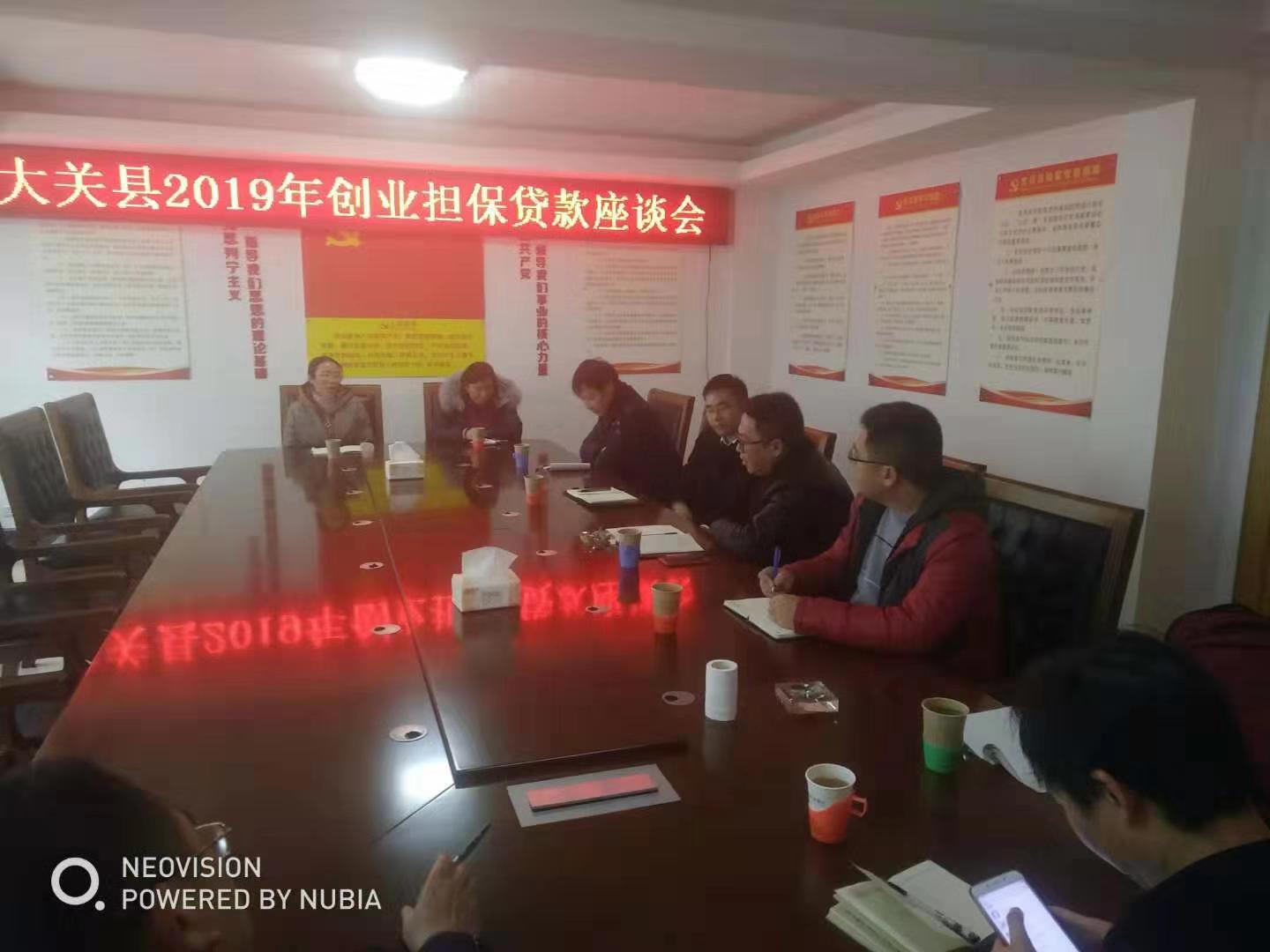 2月19日,昭通辦事處負責(zé)人朱磊攜辦事處人員到中國農(nóng)業(yè)銀行大關(guān)縣支行與大關(guān)縣勞動就業(yè)局局長鄧飛、大關(guān)縣財政局涉外科陳清華、農(nóng)業(yè)銀行大關(guān)縣支行行長袁龍強圍繞農(nóng)擔(dān)與政府協(xié)議開展座談。