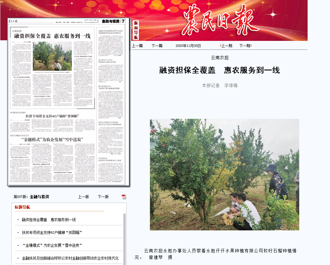 10月,國家農(nóng)擔公司微信公眾號“農(nóng)擔經(jīng)驗談”專欄中對云南農(nóng)擔公司認真貫徹落實云南省脫貧攻堅等扶貧政策,支持麗江永勝縣農(nóng)業(yè)生產(chǎn)、帶動貧困戶脫貧增收,積極為當?shù)匦滦娃r(nóng)業(yè)經(jīng)營主體提供融資擔保服務進行了宣傳?!掇r(nóng)民日報》從國家農(nóng)擔公司了解到云南農(nóng)擔支農(nóng)惠農(nóng)的相關(guān)情況后,11月30日以《融資擔保全覆蓋 惠農(nóng)服務到一線》為題報道了云南農(nóng)擔公司成立以來,不斷完善分支機構(gòu)布局,實現(xiàn)了機構(gòu)、業(yè)務和人員的全面下沉,形成了覆蓋全省的農(nóng)擔基層服務網(wǎng)絡體系,以點帶面、立足當?shù)?,為推動縣域經(jīng)濟和云南高原特色農(nóng)業(yè)產(chǎn)業(yè)發(fā)展、推進農(nóng)業(yè)供給側(cè)結(jié)構(gòu)性改革、助力脫貧攻堅、助推“鄉(xiāng)村振興”戰(zhàn)略實施發(fā)揮了積極作用。