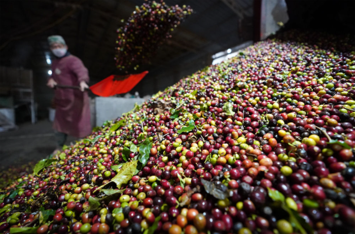 這2月22日在云南普洱市一家咖啡生產(chǎn)企業(yè)內(nèi)拍攝的新收購(gòu)并準(zhǔn)備進(jìn)行處理的咖啡鮮果。新華社記者 陳欣波 攝