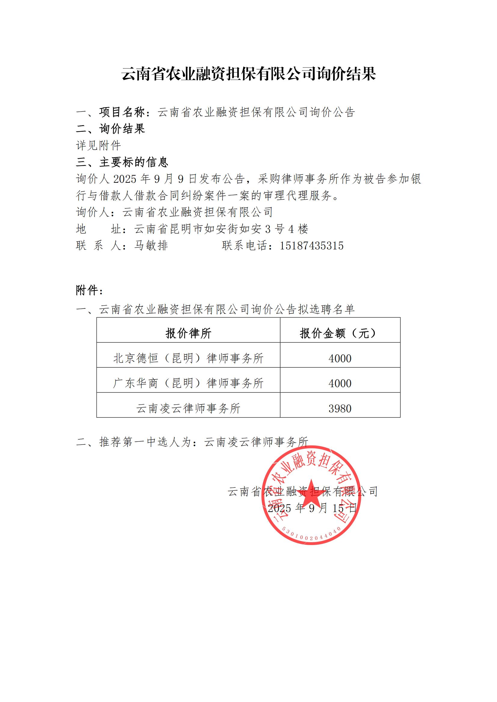 云南省農業(yè)融資擔保有限公司詢(xún)價(jià)結果