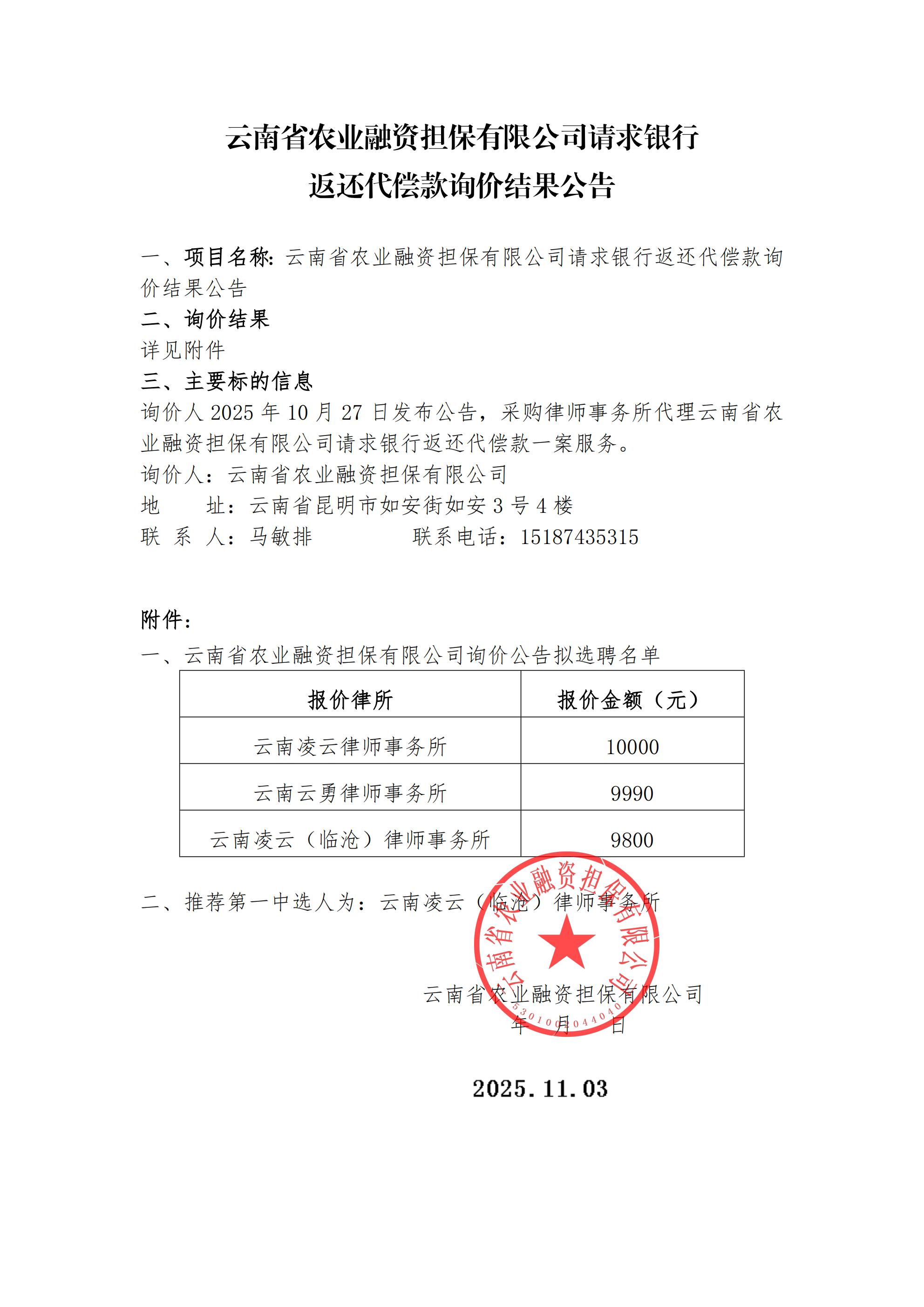 云南省農業(yè)融資擔保有限公司請求銀行返還代償款詢(xún)價(jià)結果公告-云南農擔|云南農擔公司|云南省農業(yè)融資擔保有限公司