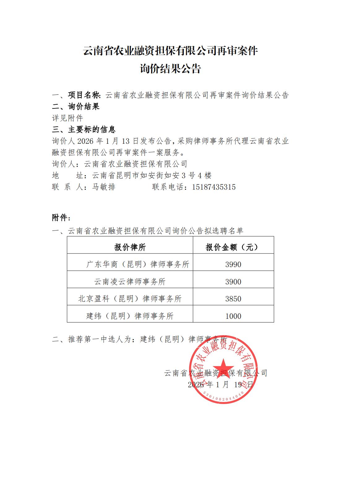 云南省農業(yè)融資擔保有限公司再審案件詢(xún)價(jià)結果公告