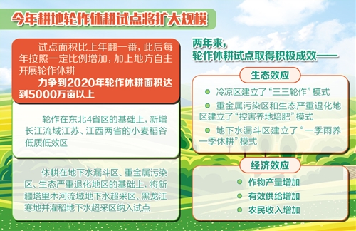 在2月23日的農業(yè)部新聞發(fā)布會(huì )上,農業(yè)部種植業(yè)司司長(cháng)曾衍德表示,今年我國耕地輪作休耕試點(diǎn)將擴大規模,試點(diǎn)面積比上年翻一番,此后每年按照一定比例增加,加上地方自主開(kāi)展輪作休耕,力爭到2020年輪作休耕面積達到5000萬(wàn)畝以上。同時(shí),還將實(shí)現區域拓展。輪作在東北四省區的基礎上,新增長(cháng)江流域江蘇、江西兩省的小麥稻谷低質(zhì)低效區;休耕在地下水漏斗區、重金屬污染區、生態(tài)嚴重退化地區的基礎上,將新疆塔里木河流域地下水超采區、黑龍江寒地井灌稻地下水超采區納入試點(diǎn)范圍。